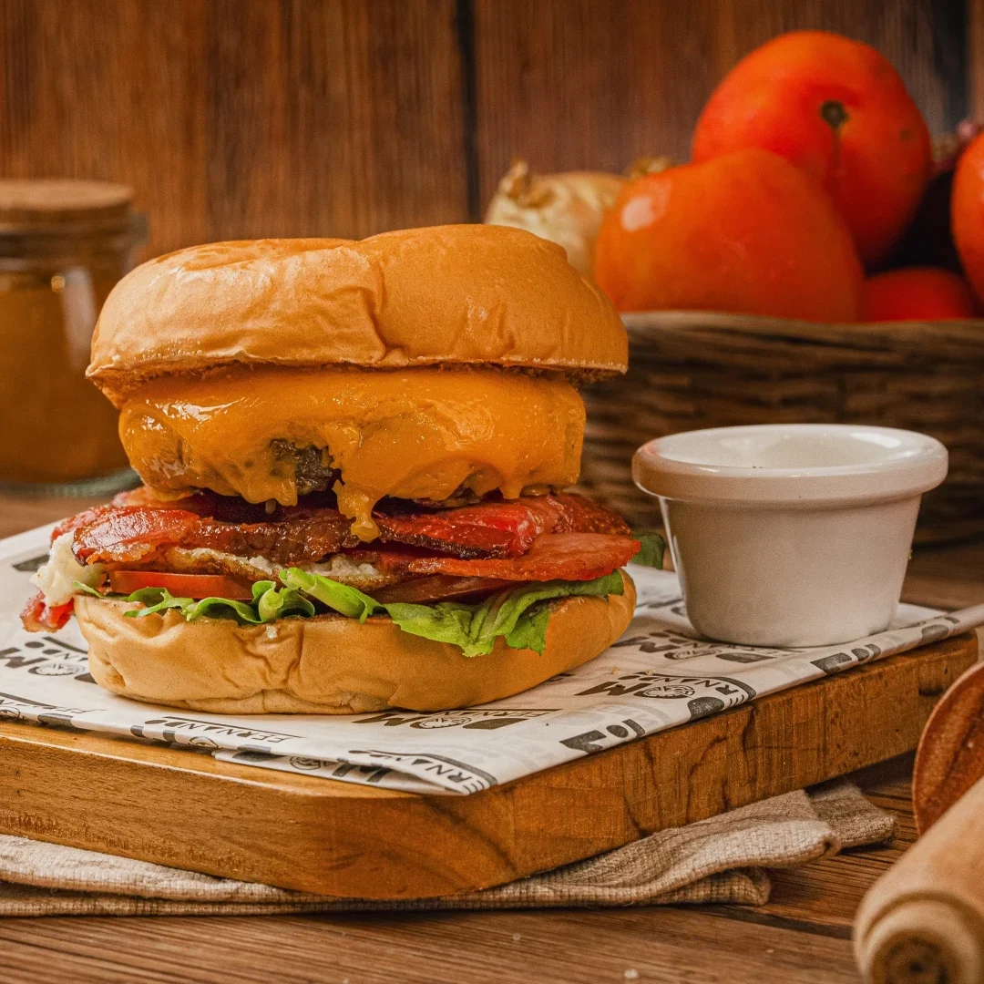 Pão de brioche, maionese DF, hamburguer 150g, queijo chddar, ovo, bacon, tomate e rúcula.
