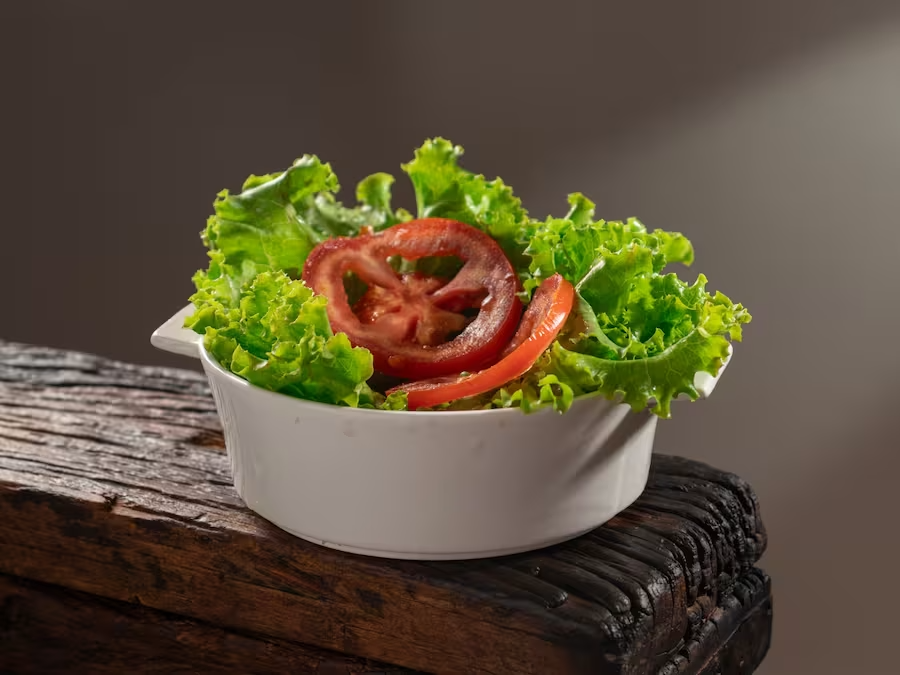 Alface, tomate, beterraba, pepino, rúcula, repolho, cenoura, palmito, ovo de codorna, cebolinha em conserva e pimenta biquinho.