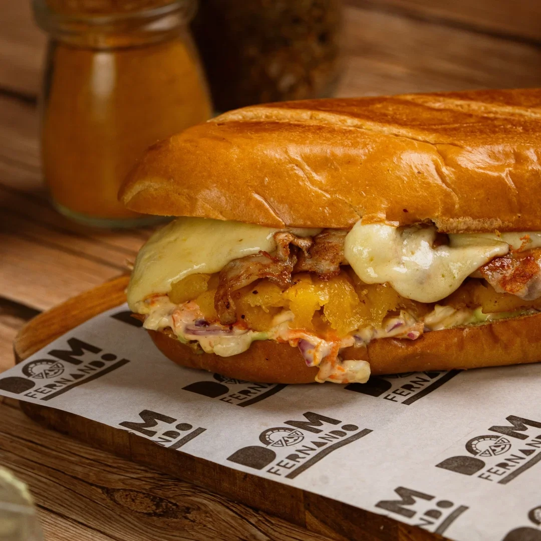 Pão baguete, lascas de lombo suíno grelhado, muçarela, abacaxi grelhado e salada americana