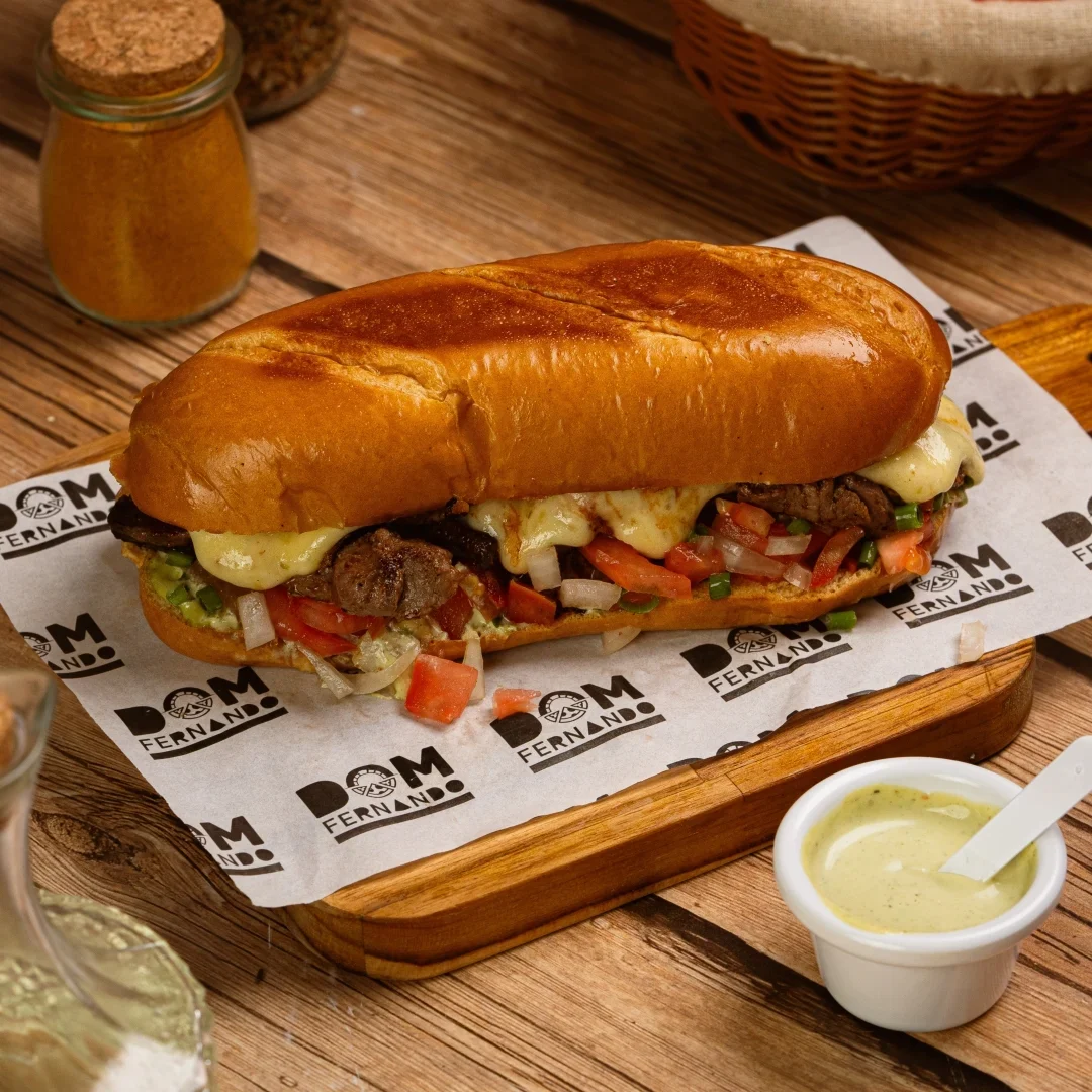 Pão baguete, lascas de picanha grelhada, com muito queijo provolone, molho chimichurri, tomate, cebola roxa e rúcula.