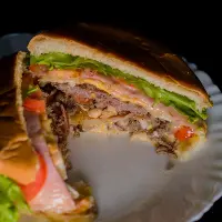 Pão, Catupiry, hamburguer, presunto, muçarela, tomate, alface e milho.